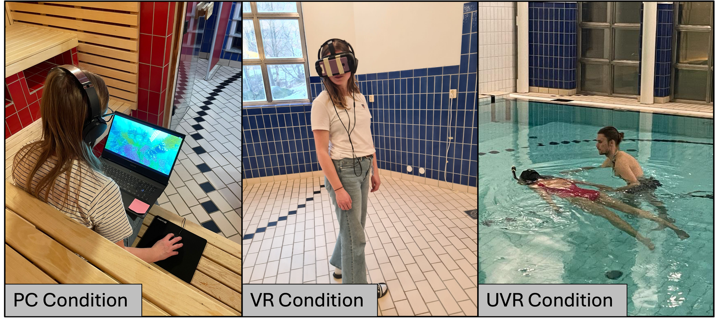 In this study, 214 participants were randomly assigned to experience underwater videos through one of three formats: a computer screen (PC), a standard VR headset (VR), or UVR. They watched two short 360° underwater films featuring marine wildlife, and their reactions were measured before, after, and one month later.